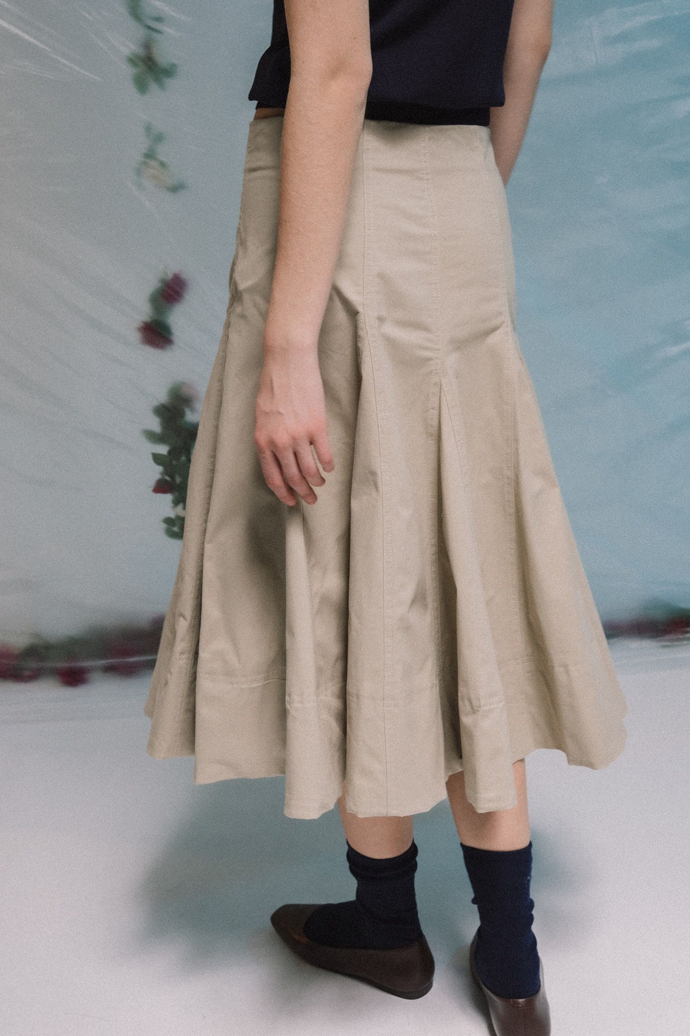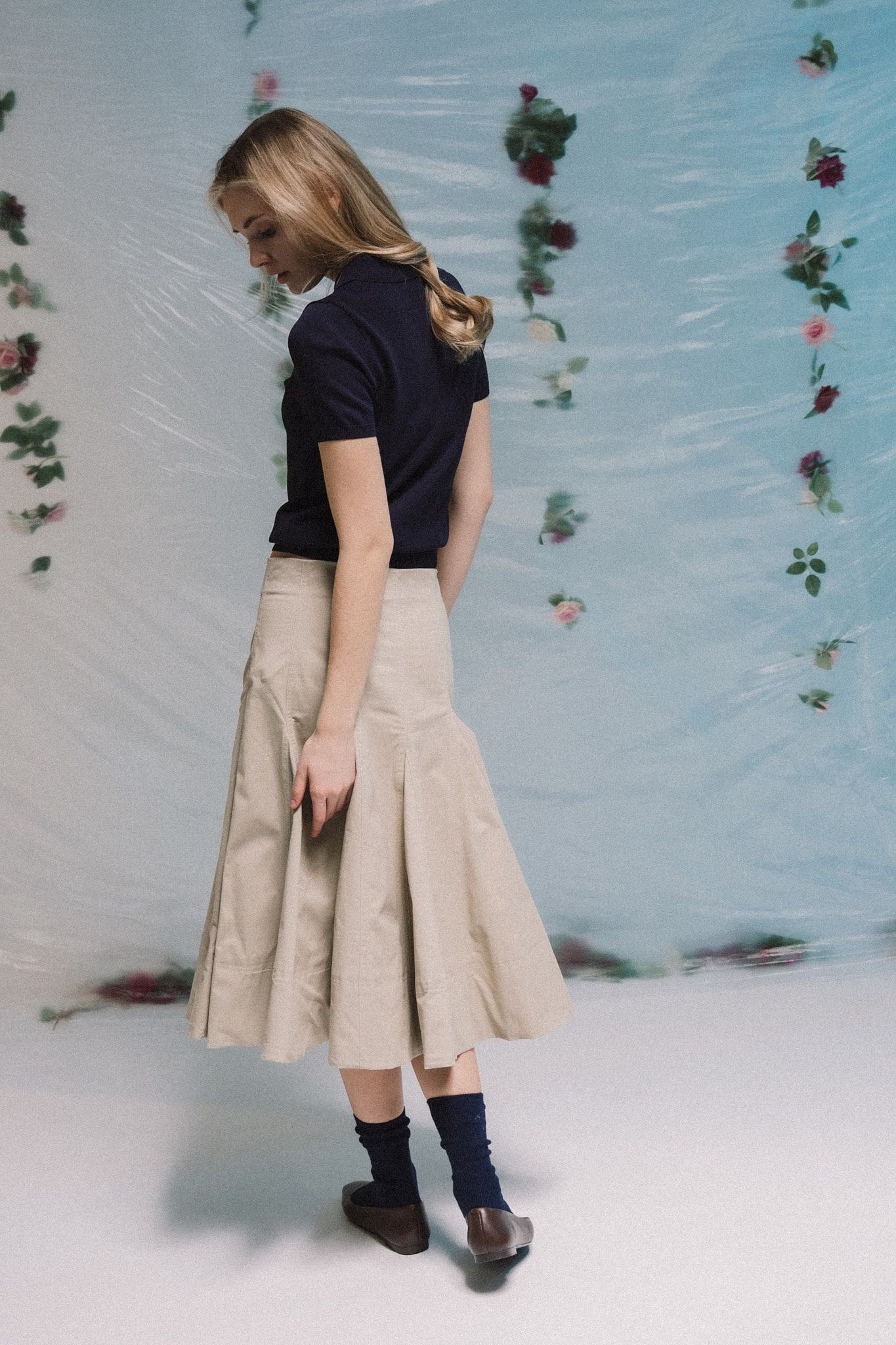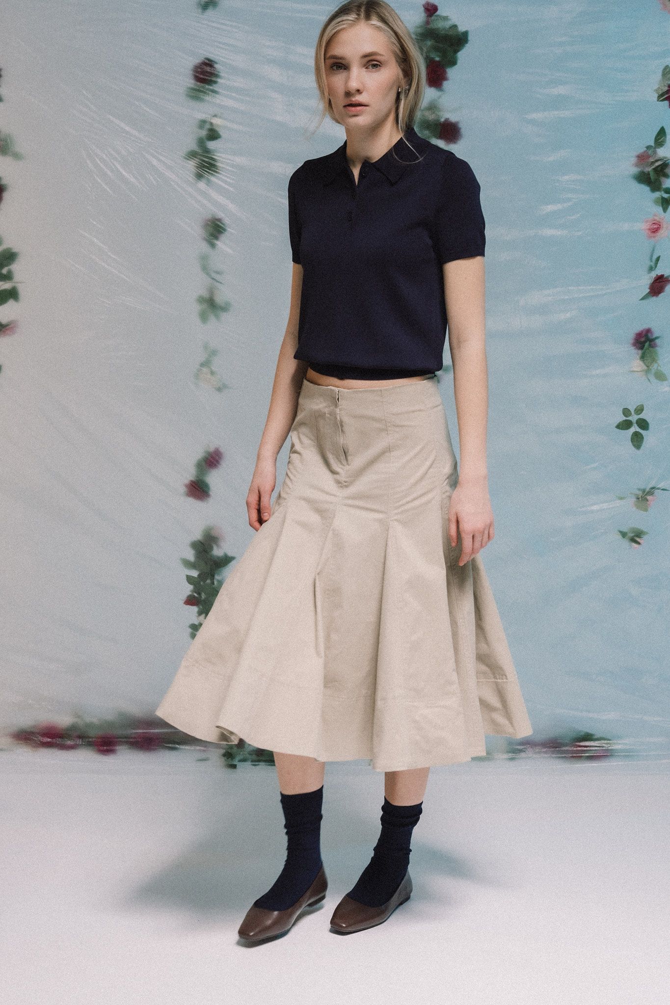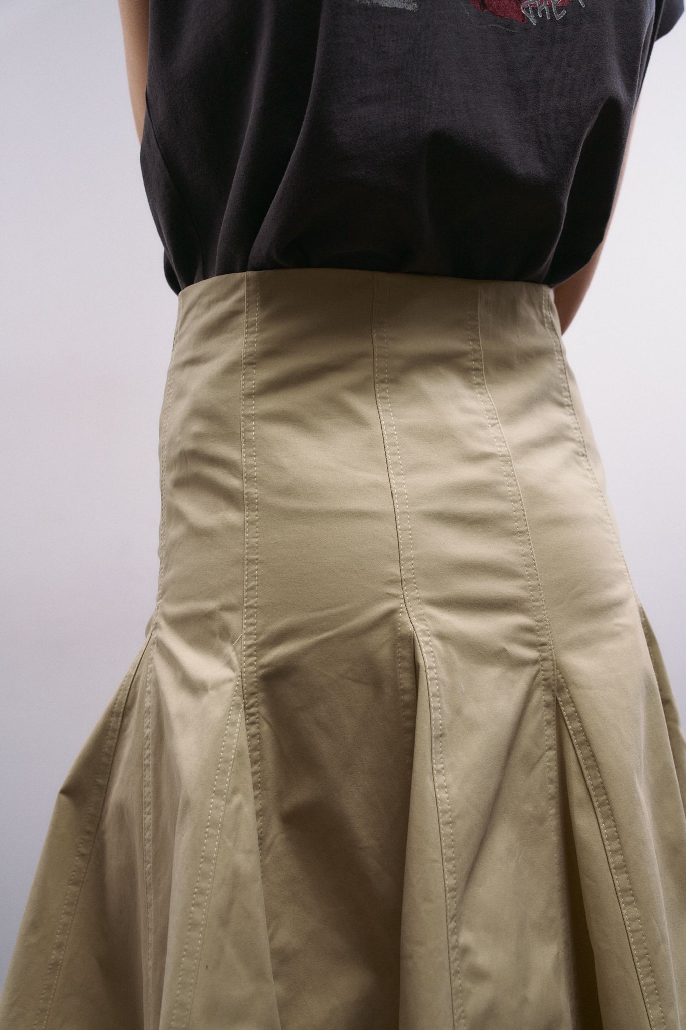 Юбка миди с завышенной талией из плотного хлопка. Низ со складками. Застежка на потайную молнию в шве.
